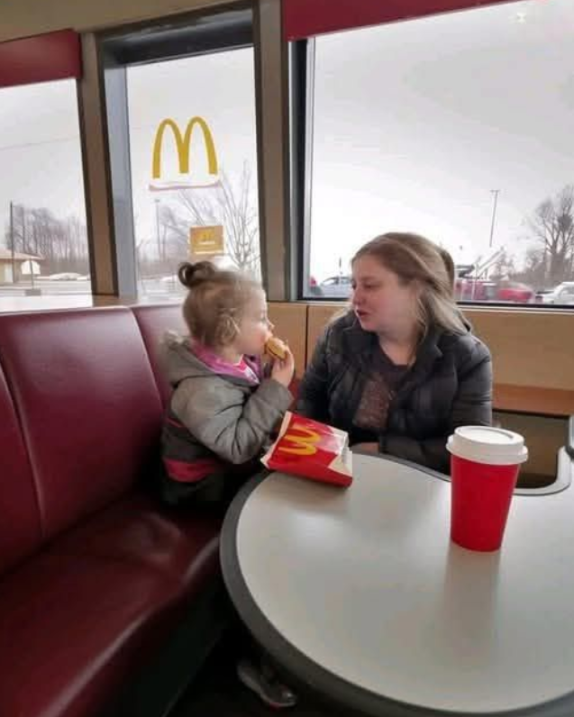 The girl softly asked, “Can we eat here, please?”They bought one hamburger and sat at the table next to mine. Then, the mom took a thermos out of