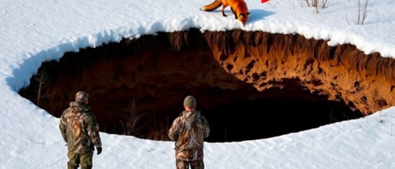 The hunters followed the fox to a deep trench in the middle of a vast, snow-covered field — and when they looked inside, what they saw left them