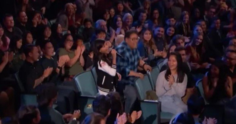 Maddie stood up and sang an a capella version of “Amazing Grace” that had the whole crowd cheering. Not only that, but she got the attention of the judges, who asked her to come up on stage and show them what she’s got.