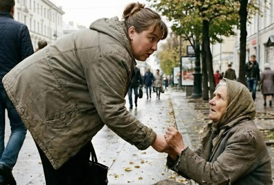 That morning began the same. A light drizzle fell, the asphalt shimmered, people hurried by without lifting their eyes. Susanna reached into her pocket for coins, bent down — but before she could drop them, the old woman suddenly grabbed her wrist.